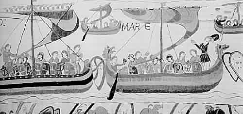 The Normans invade England in their Viking longboats, 1066. From the Bayeux Tapestry, France. Originally Vikings ('Norse-men' which then became 'Norman') who had settled in France (in 'Normandy'), under their leader, the 7th Duke of Normandy, William the Conqueror, they invaded England, linking that country to France.