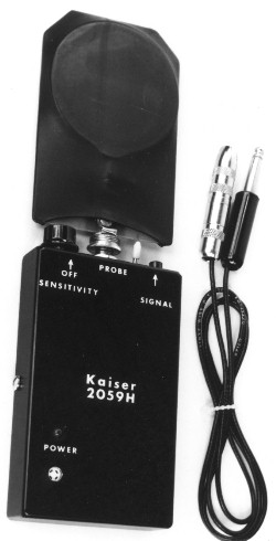 ![]() The 2059HV is a very low frequency (VLF) detector that covers from approximately 5 to 200 Kilohertz (KHz). Many, but not ALL, tape recorders contain a bias oscillator that operates in this frequency range. The 2059HV indicates this bias oscillator radiation via a small signal light or vibrator. Detection ranges from 6 to 60 inches (15 to 150 centimeters). OPERATION: Turn the unit ON by rotating the SENSITIVITY control in a clockwise direction. The POWER light emitting diode (LED) indicates that the unit is ON. Place the YELLOW SIGNAL switch in the DOWN position. Turn the SENSITIVITY control to maximum. If the RED signal light comes on, slowly decrease the SENSITIVITY until the light is barely extinguished. Pass the 2059HV probe over the suspect package or area. The RED SIGNAL light will indicate an operating tape recorder in the record mode. If a vibrating alarm is desired, place the YELLOW switch in the UP position. The 2059HV may also be worn covertly. Remove the probe from the main detector assembly and plug it into the extension cable supplied. Pass the cable up through a shirt or coat sleeve and down to a pocket. Plug the cable into the PROBE jack on the detector and place it in the pocket. The 2059HV draws approximately 8 milliamps in standby and 20 to 40 milliamps in the ON state. Normal battery life is approximately 40 hours. The unit is powered by two (2) 9 volt Alkaline batteries. To replace the batteries, loosen the two screws on the side of the detector assembly one or two turns. With the printed side down, carefully lift off the back cover. Remove the old batteries and replace with fresh ones. Replace the back cover, being careful not to pinch the battery leads. Tighten the two screws (don't over-tighten).