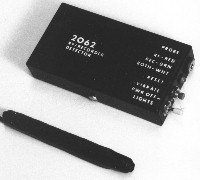 INSTALLATION/OPERATION: Insert the VLF probe/antenna into the PROBE jack. Place the main detector unit in the left side pants pocket so that the RESET button can be easily reached by the left hand. Run the probe wire around the back and down the right sleeve so the probe rests on the lower edge of the right arm midway between the wrist and elbow. Use the expansion band supplied to fasten the probe in place. This position will assure that the probe passes as close as possible to any suspect transmitter or recorder while shaking hands or gesticulating. Turn the PWR switch to the VIBRATE position: the vibrator should indicate briefly. Press the RESET button. The unit then automatically adjusts its sensitivity to ambient signal conditions. The 2062 is broadband and will indicate the presence of all RF transmitters operating in the range of 1 to 2,000+ MHz including aircraft, CB, taxi, etc. transmitters. The latter can be readily identified by the fact that their carriers (transmitted signal) will be keyed on and off fairly quickly. A surveillance device or recorder, on the other hand, will emit a constant signal thereby keeping the light or vibrator indicating continuously. When using the 2062 bear in mind that it indicates when the received signal increases. If, when an area is approached, the unit indicates, back away from that area and press the RESET button. If the signal appears to be random interference, again press the RESET button to adjust the 2062 for that signal level then re-approach the desired area.