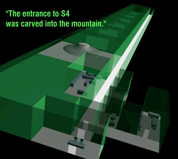 When the bus that transported Lazar and others from the Groom Lake facility reached Papoose Lake or S4, it made a sharp left turn after it passed the hangar doors to its left. Once stopped, the bus door opened out to another steel door inset in the side of the mountain. The "workers" would step out, past guards holding barking snarling dogs. Except these dogs were different. For all the fangs and snarling and barking, there was no sound coming out. The dogs had their vocal chords cut out to avoid being detected. Once inside the door, there was a single guard sitting at a desk in a barren room. Behind him was a door. The entrants were checked and led to another small room with a handreader and another door. This door led into the long hallway which ran the length of the hangar doors and also led to the briefing rooms, restroom and nurse's station. The white areas are the only areas Lazar was allowed to cover. And even then under guard. |