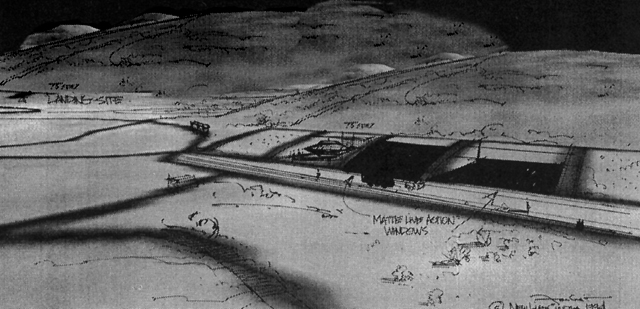 These illustrations were drawn on top of actual spy satellite photos of the Papoose dry lakebed in central Nevada. The coordinates of the hangar doors are N 37° 01' 40", W 115° 46' 35".