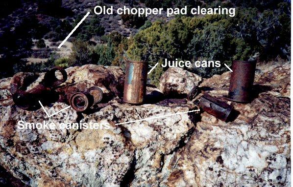 Looking around, I didn't see anything out of the ordinary at first, but I wasn't sure exactly what I was looking for. Then, on the other side of a rock outcropping, I found the remains of an old campfire. In the campfire was some odd, folded sheets of aluminum foil and old juice cans, some with olive drab paint. G.I. apple juice! Scattered around the campfire area were old, rusted military smoke canisters. This must be the spot! I spent quite some time wandering to the east in a futile effort to find anything there. Perhaps there wasn't anything left, after all, it was just Ray and his ejection seat. I returned back to the campfire area to consider it all. As I was doing so, my eye caught something only 75 feet away. It was the remains of an old cleared area, just big enough for a chopper. The junipers and cedars had been cut off low, and dragged just outside the perimeter of the clearing. Some of the vegetation had grown back, making it a little indistinct, the reason I hadn't seen it earlier.