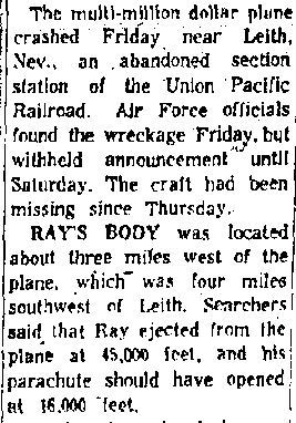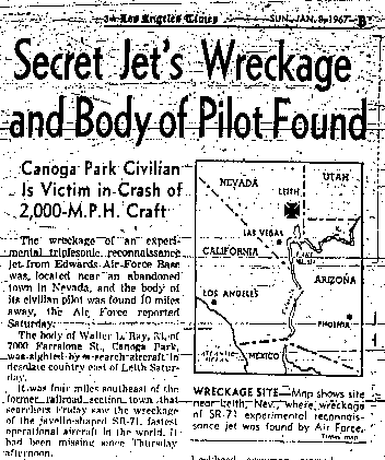 Next, I started doing the research and hit pay dirt immediately. In the Sunday, January 8, 1967 edition of the Los Angeles Times newspaper, I found a major article on the crash. The Air Force had decided to use the cover story of the crash being that of an SR-71, the unclassified sibling of the A-12. In a burst of amazing luck, the newspaper story precisely located the crash site, even showing a map! It said that the plane went down approximately four miles southeast of a place called Leith. It turned out Leith was merely a railroad siding on the Union Pacific railroad line running between Las Vegas and Salt Lake City. Leith was about 74 miles due east of the Groom Lake base, so a location about four miles southeast would be around 76 miles from Groom. This matched reasonably well with the official CIA history. This was going to be too easy! Maps of the area were secured, and I made plans to meet out there with Pete and we'd find this thing.