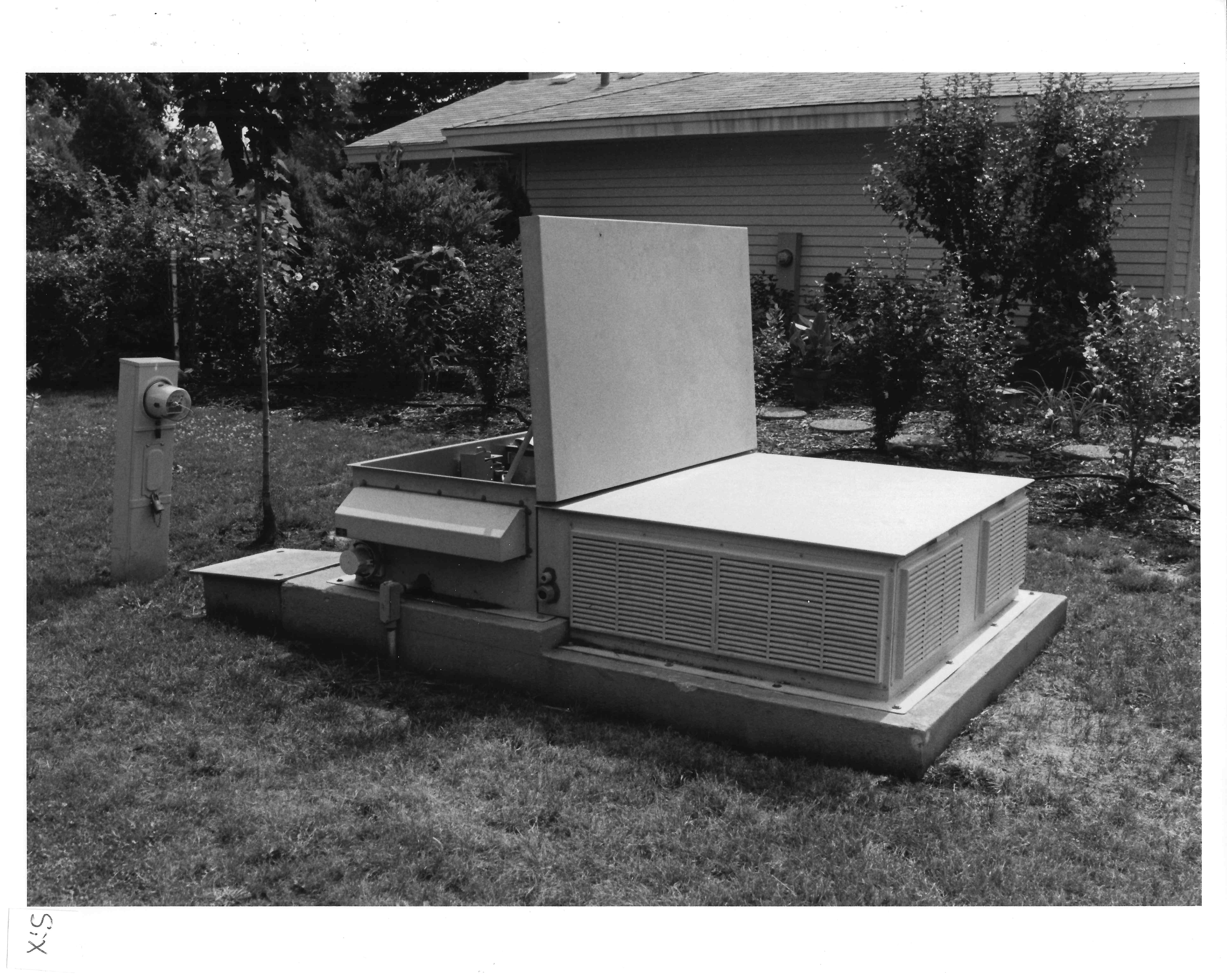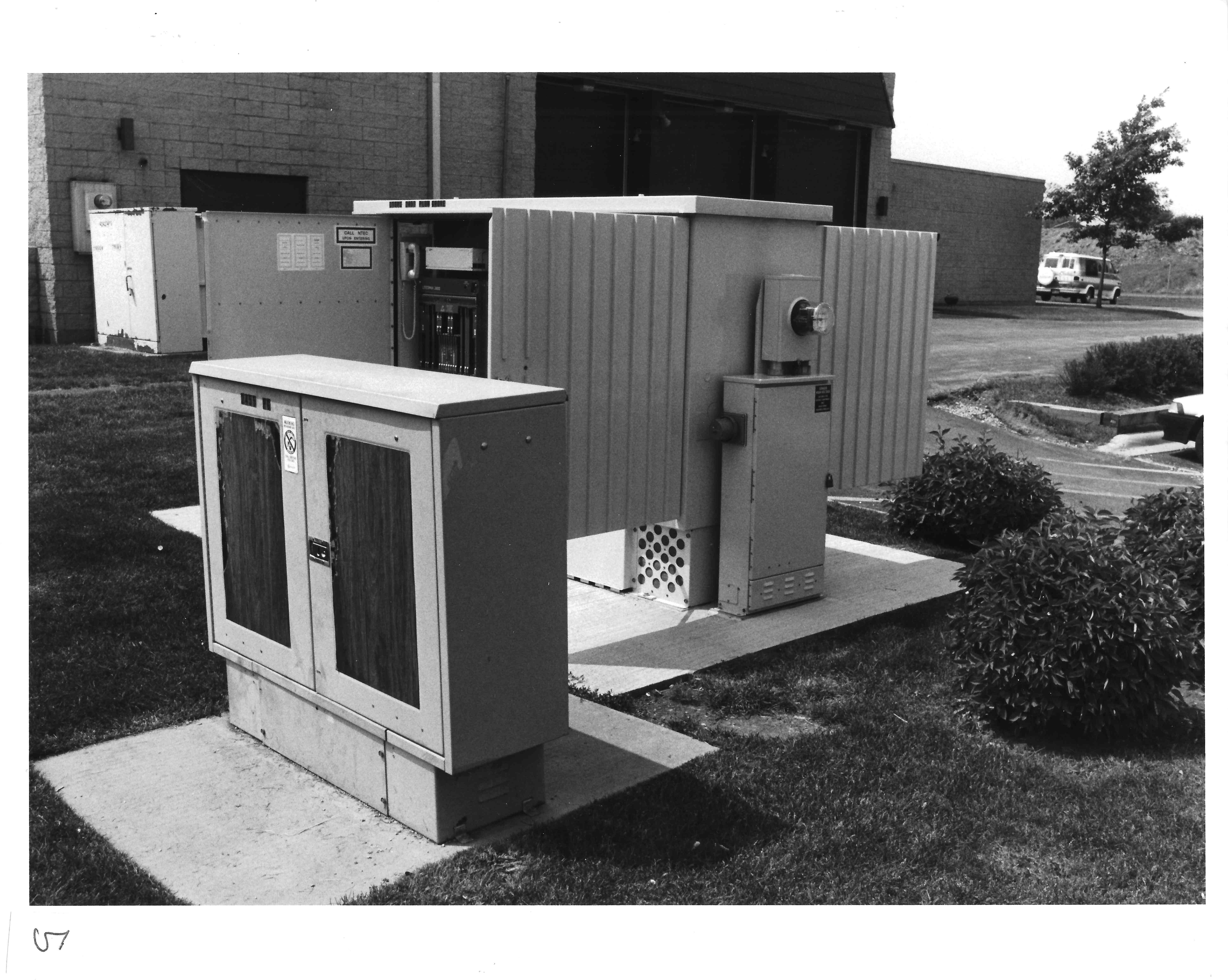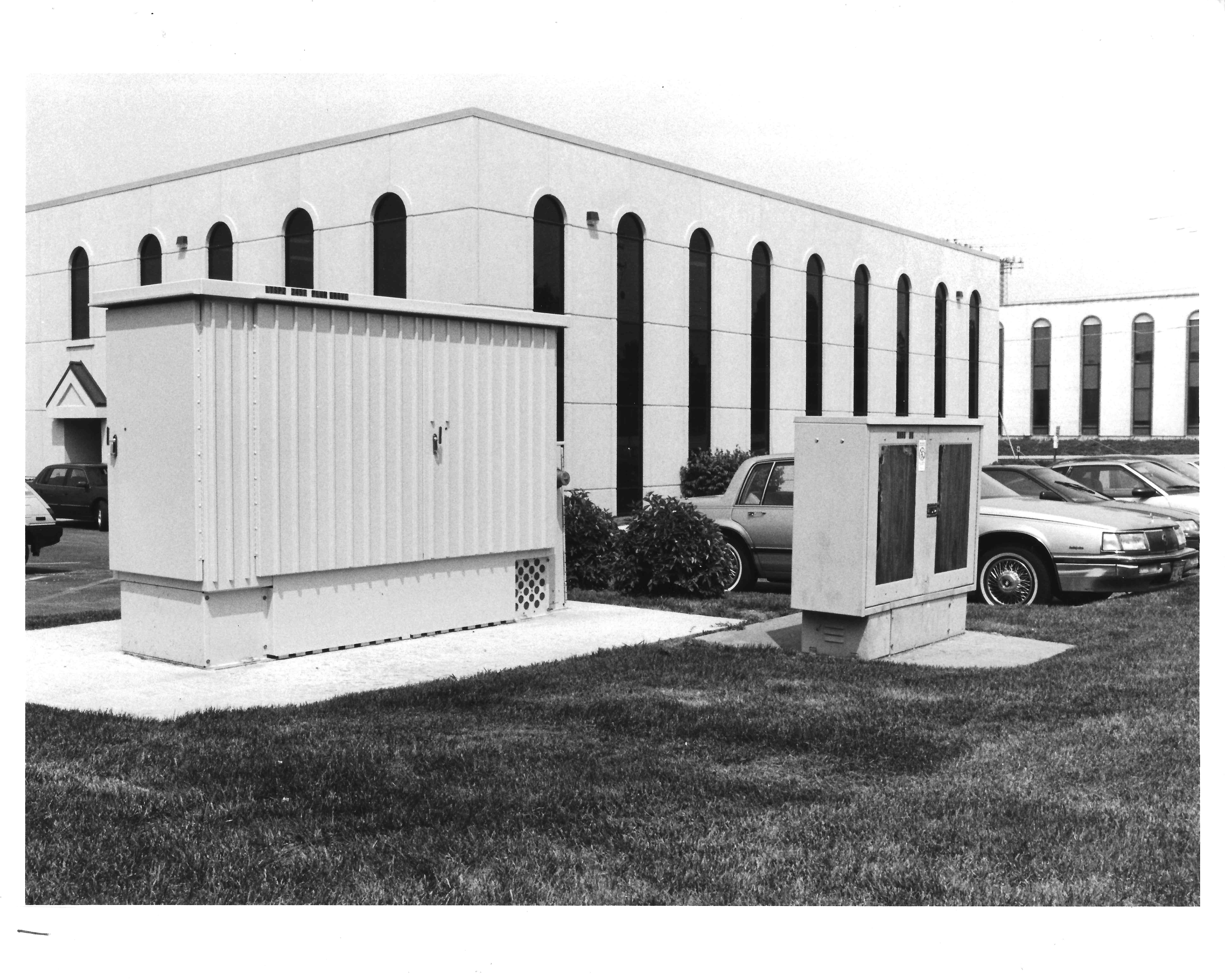 This is an external view of a DSC Litespan 2000, model 2020. The smaller cabinet is a conventional cross-connect box and is described later. This cabinet is approximately 3 feet wide, 9 feet long and a little over 6 feet high. It rests on a 10 by 14 foot concrete pad. Prior to pouring the pads, four cable conduits were installed for telephone cable at one end and additional conduits for commercial power were installed at the other end. This particular cabinet is designed to work with fiber optic transmission cables. At maximum capacity, this cabinet is capable of serving 2016 lines. The base is designed to hold up to 40 12-volt batteries to maintain service in case of commercial power failure. These batteries can be recharged using a portable generator if the commercial outage is extensive.
