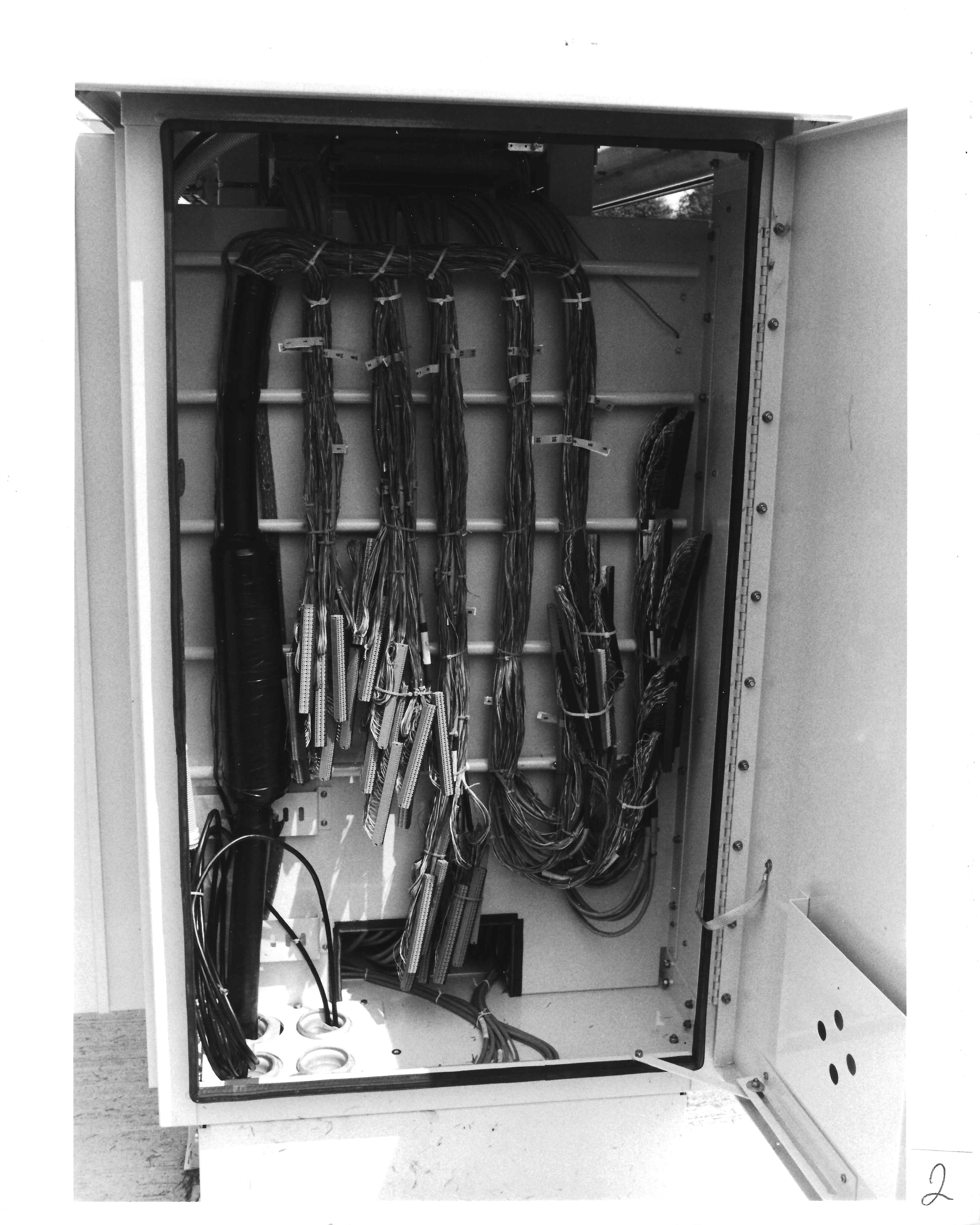This shows the telephone cables entering the splice chamber. The small plastic devices attached to the individual wires are splices which connect the individual loops to the cabinet's internal electrical equipment. Before each line enters the electronic package it passes through protection equipment which safeguards the line from lightning surges and other over voltage situations. Both sides of the cabinet open up to provide access to the loop electronics and protections circuitry.