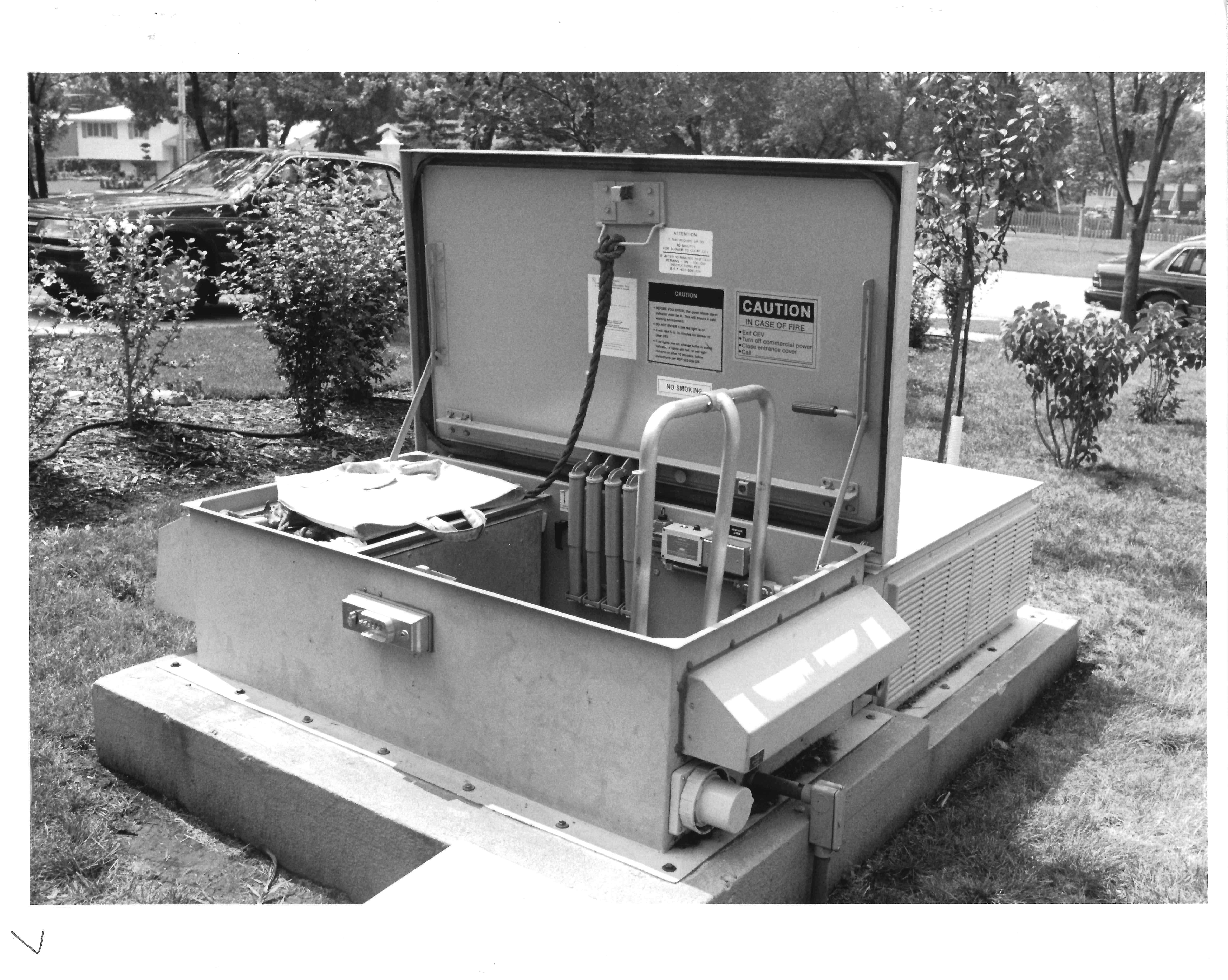 A coded door lock (Simplex) secures the hatch. Opening the access hatch activates an intrusion alarm which results in the monitoring center being notified via telemetering equipment that the hatch has been opened. A view of the status lights indicating when it is safe to descend and the ladder leading down to the interior of the CEV are shown in the picture. Employees must check these indicators before entering. Upon entering the vault, employees must call the monitoring center and provide appropriate identification and indicate the purpose of their entry.