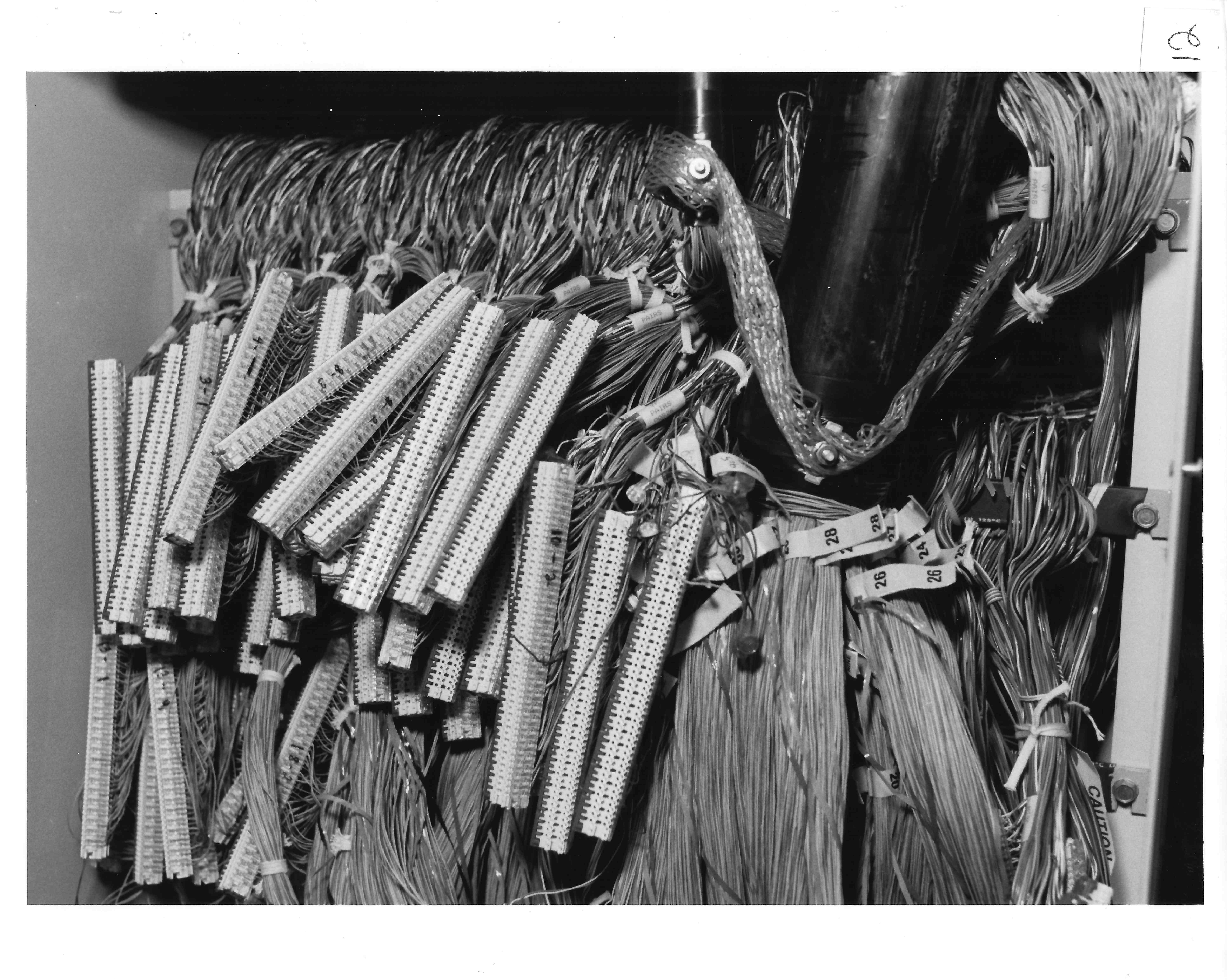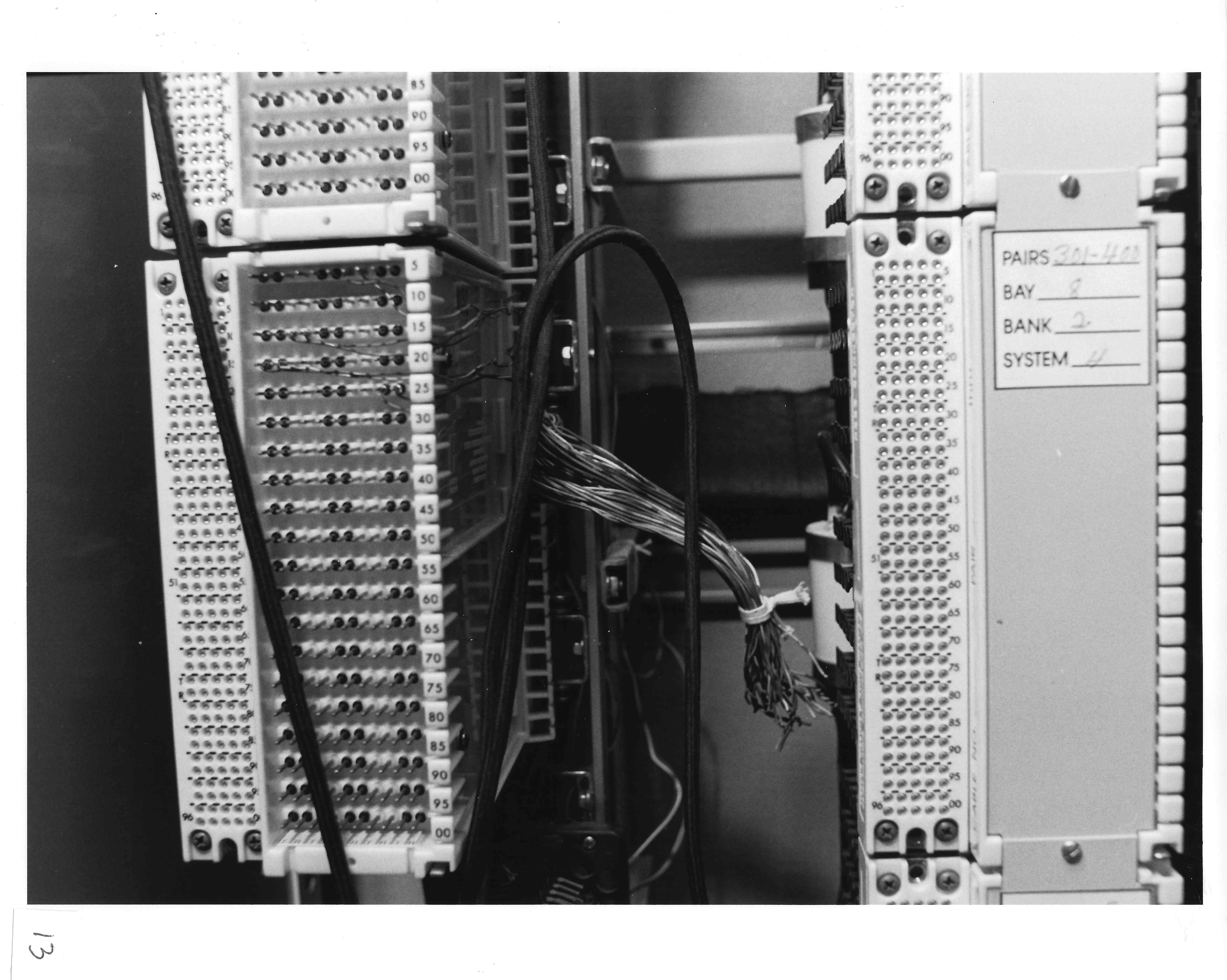 Splices from a different angle. Although obscured by the wiring and splices, the rear of the connecting blocks on the opposite side of the cabinet are located immediately behind the splices. Additional connecting blocks are located to the right of the cable splices.