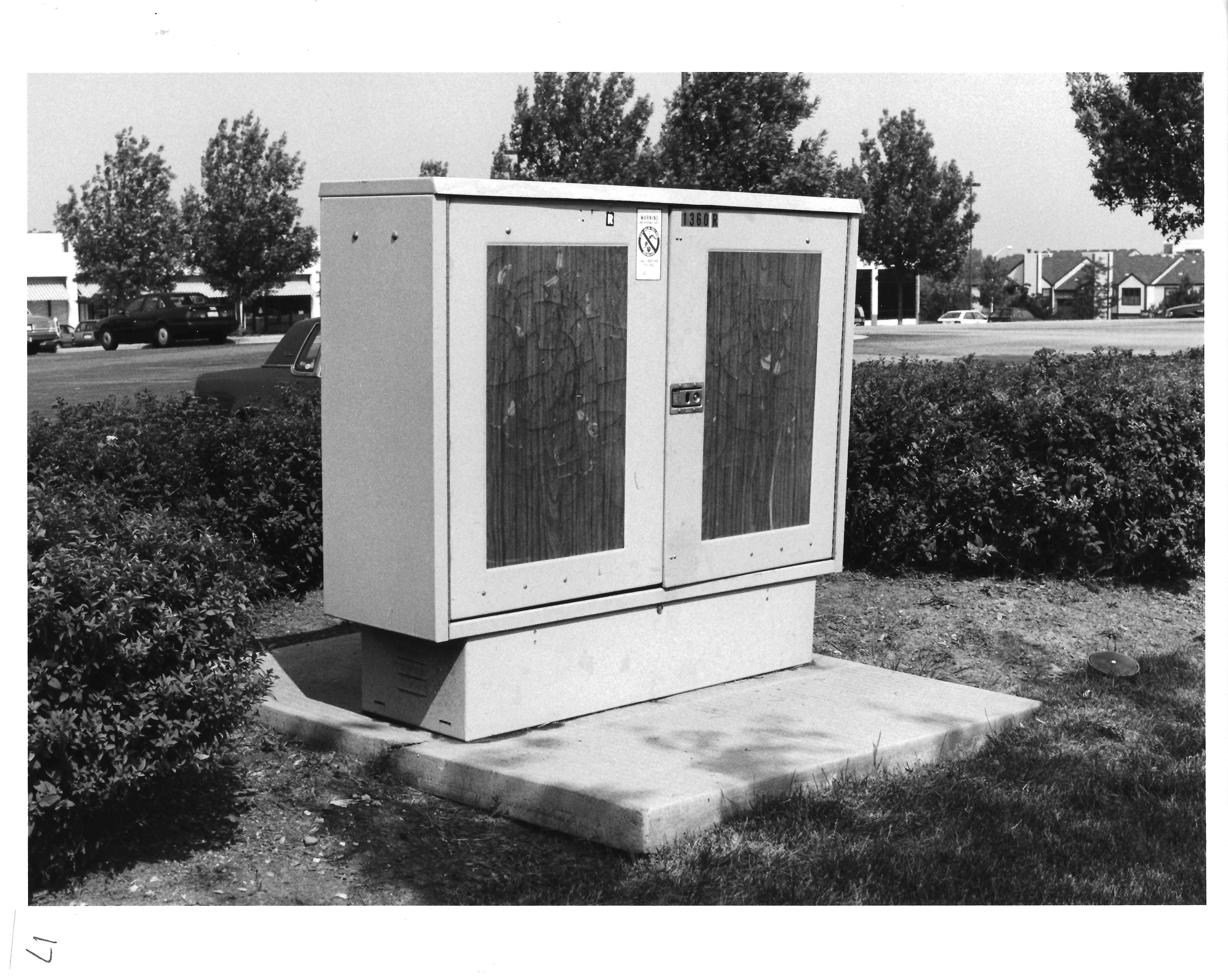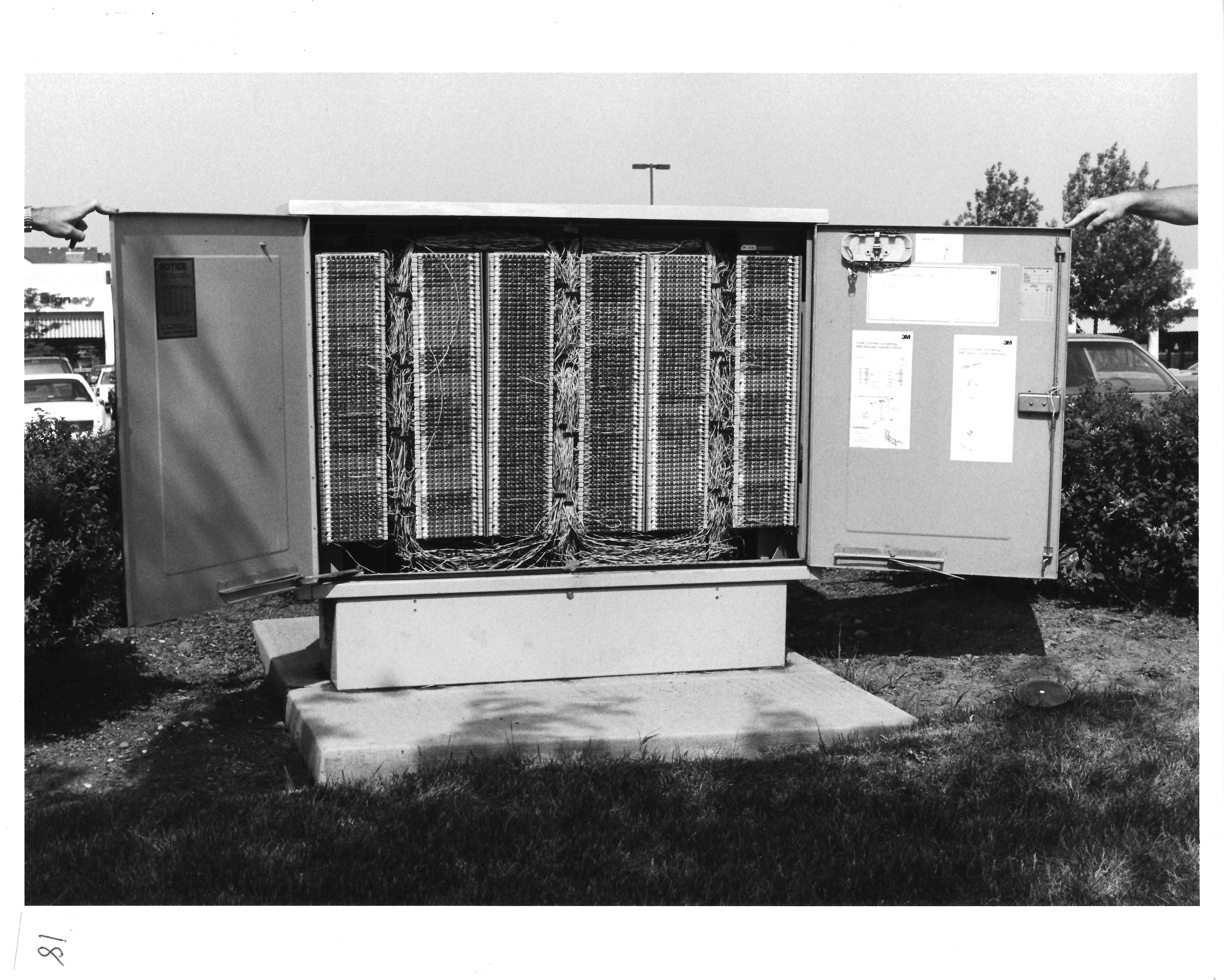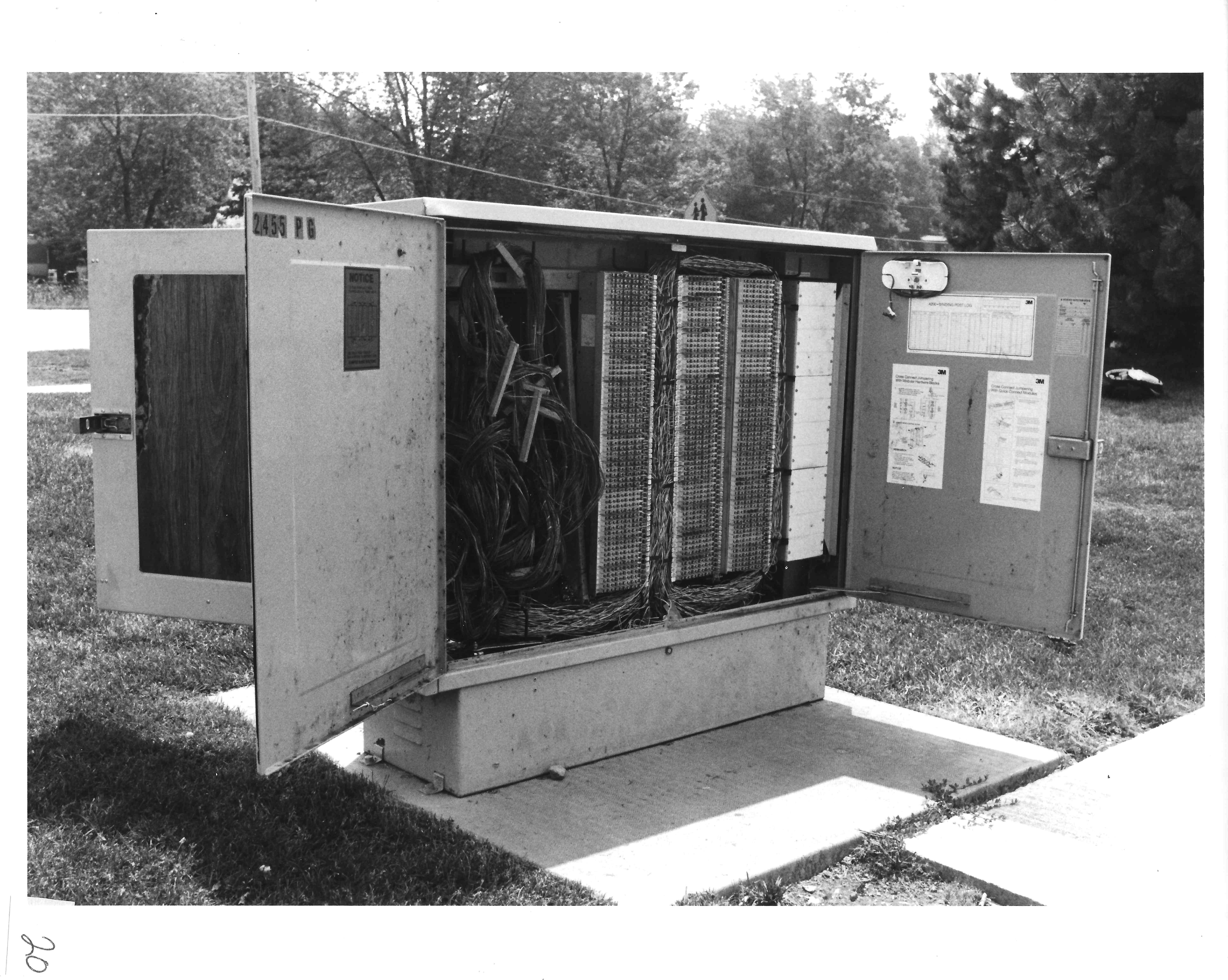 This is a cross-connect box. It is used to cross-connect feeder cables to local distribution cables serving the immediate area. The box's physical dimensions are 17 inches wide, 5 feet long and 4 feet high. Doors on both sides of the cabinet swing open to provide the technicians access. The box is engineered to economically connect the pairs serving the immediate area to the feeder cables coming from the central office or in some cases from a CEV or remote terminal.