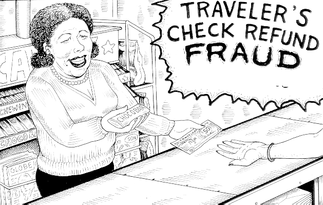 Traveler’s Checks Refund Fraud is a quick scam usually completed within one day and usually involving $500 to $3,000.