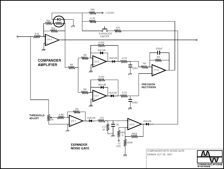 In addition, such gain boost would tend to increase or amplify background noise on recordings and in studio equipment. To alleviate this, a noise gate/downward expander was added. This provides -5dB gain reduction for levels below -45dB at the input.