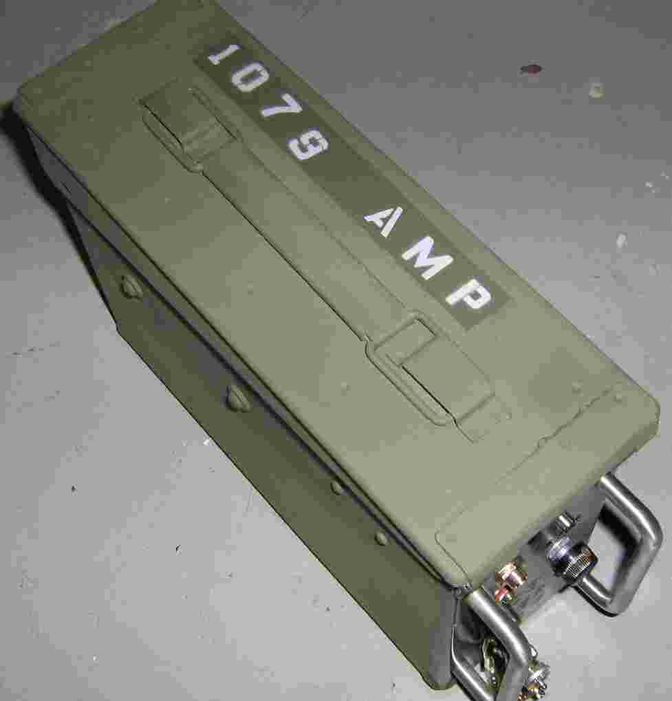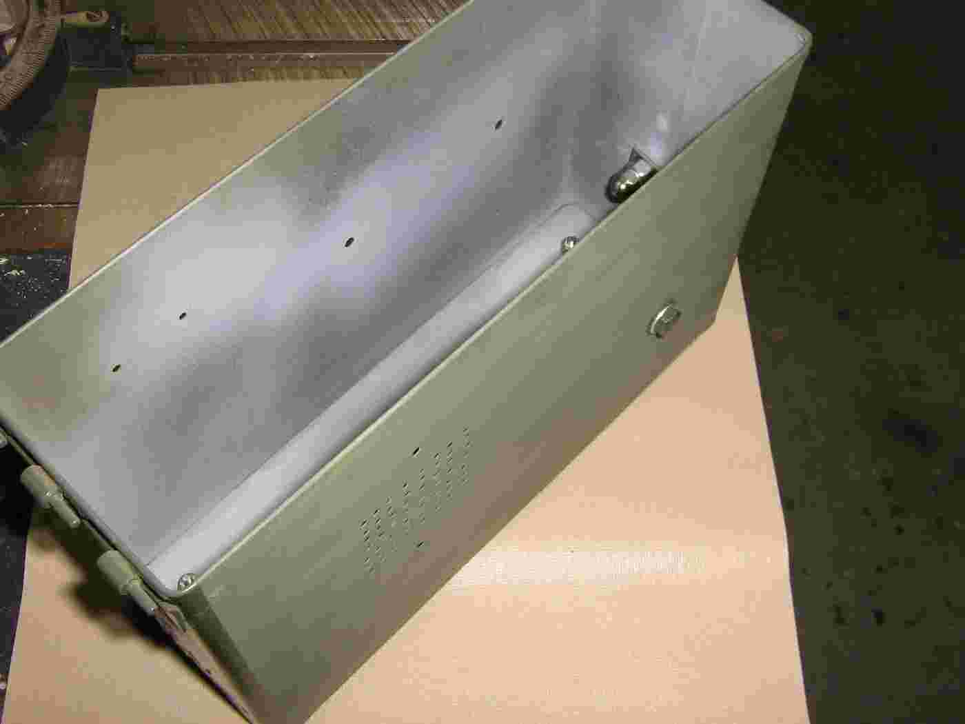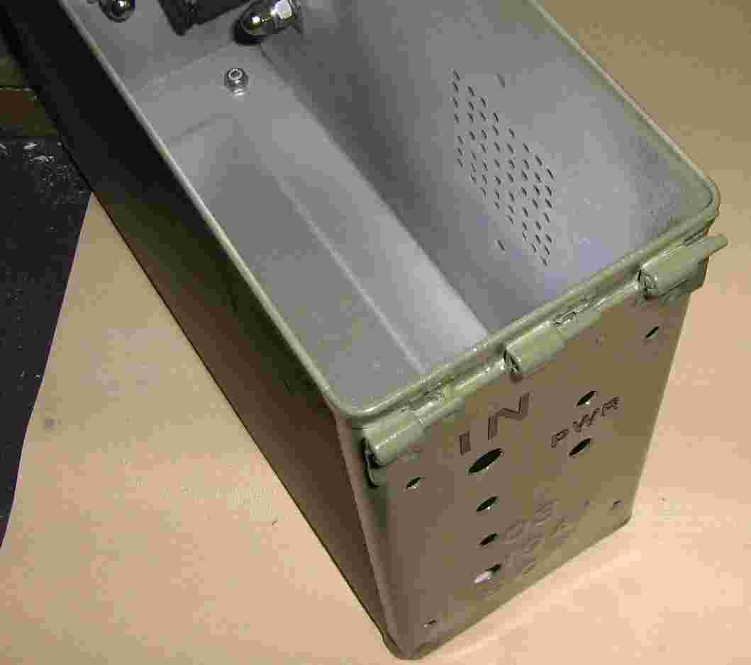 Alternate view showing the front-panel and the array of 1/8-inch diameter speaker holes. In the rear, two L-brackets secure the battery pack to the side of the case. The holes on the left side of the front-panel are for a 1/4-inch jack, a 1/8-inch jack, a RCA jack, and a BNC jack.