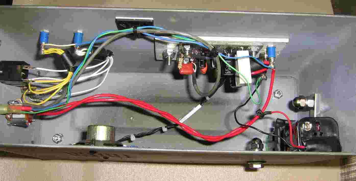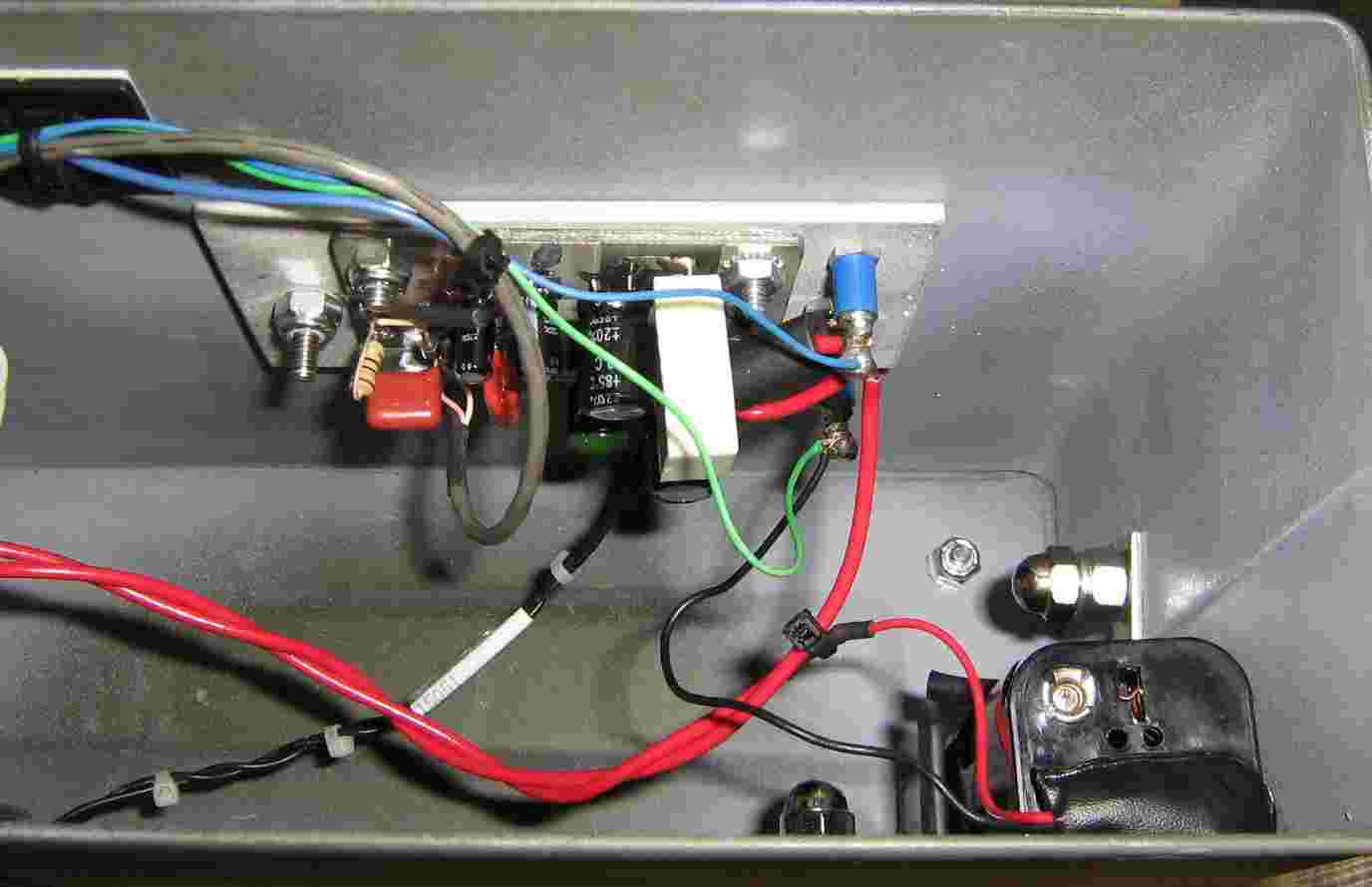 Close up picture of the main circuit board and the battery pack. Since the LM380 can draw up to one amp, you should try to use fairly heavy gauge wire for the LM380's power connections. The small blue and green wires are for the front-panel LED power indicator.