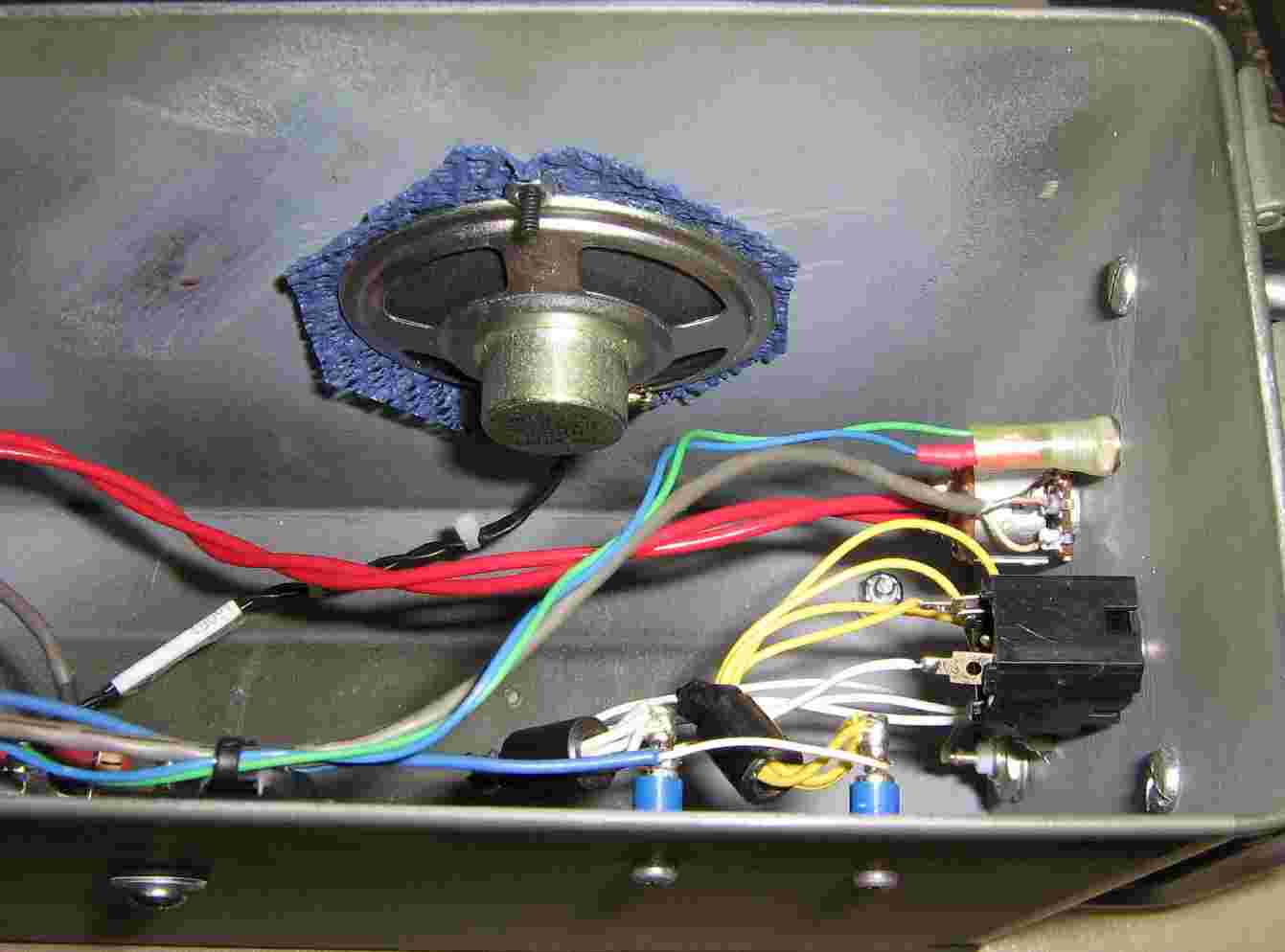 Close up picture showing the speaker and front-panel connections. A piece of "non-slip" pad is used to seal the speaker to the side of the case.