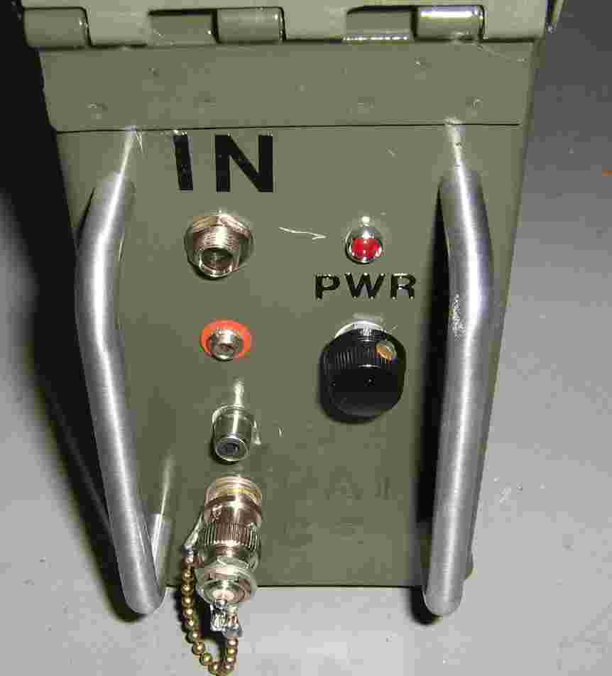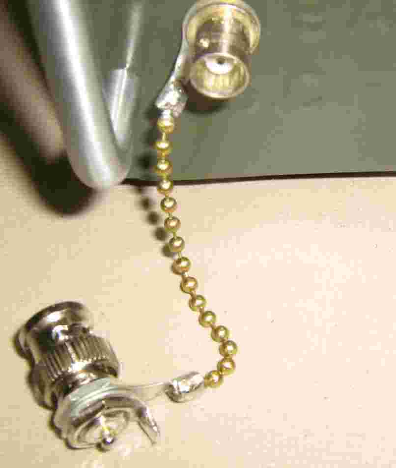 On the BNC input jack, a small chain (from a lamp pull), two solder tabs, and a male BNC connector, were used to make a protective cap which also doubles as clip-on points for alligator clips.