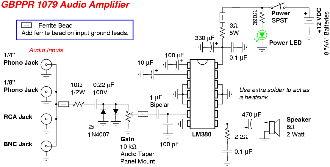 The GBPPR 1079 Audio Amplifier is a handy little device which can be used as an audio preamplifier while performing TSCM sweeps. It is based around the National Semiconductor LM380 2.5 watt audio power amplifier chip and is powered from a series of eight "AA" Alkaline batteries. It is not designed to run off a single 9 volt battery, or even carbon-zinc batteries, due to the LM380's fairly high current draw (up to 1 amp). The LM380 has a fixed voltage gain of 50, or +34 dB, and is designed to only amplify low-level signals. For this design, we'll have a variety of input jacks for different test leads. This is helpful if you don't have any adapters or just want to use a set of alligator clips to route your signal. One of this design's drawbacks is that the LM380 needs a fairly large copper ground plane for dissipating heat. The circuit board should also be mounted to a small aluminum plate to act as an additional heatsink. This particular amplifier design was based around the reference schematic in the LM380's datasheet, but with a few changes that allow the input to be capable of handling signals up to 100 VDC. This is useful if you need to connect the GBPPR 1079 Audio Amplifier to an unknown line, and you are not sure of what voltage levels the signals could be carrying. It is NOT presently designed to connect to wires carrying 120/240 VAC power, so be careful where you clip!
