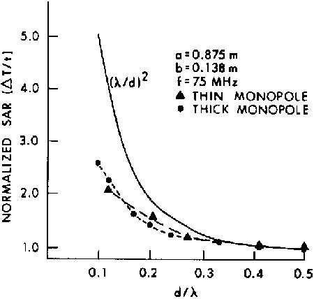 Measured relative SARs in scaled saline spheroidal models versus distance. SAR values for the