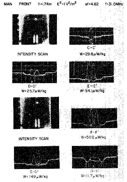 Scale-model thermograms and measured peak SAR for 70-kg, 1.74-m-height frontal-plane man model exposed to