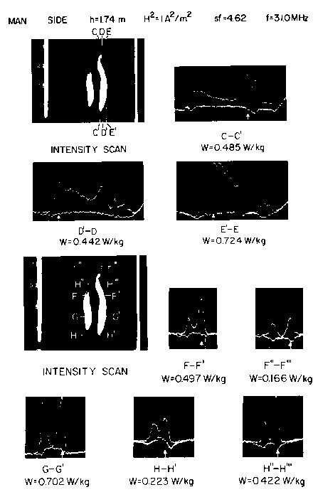Scale-model thermograms and measured peak SAR for 70-kg, 1.74-m-height medial-plane man model exposed to 31.0-MHz magnetic field perpendicular to the median plane: vertical divergence = 2ºC, horizontal divergence = 2.65 cm