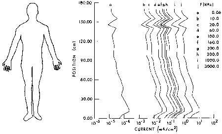 Calculated current distributions as a function of a position in man exposed to 1-kV/m VLF-MF