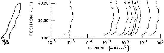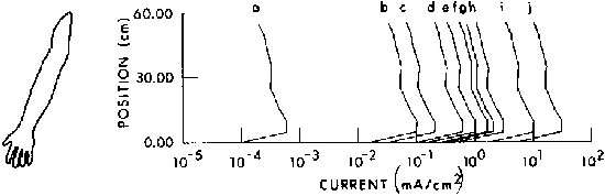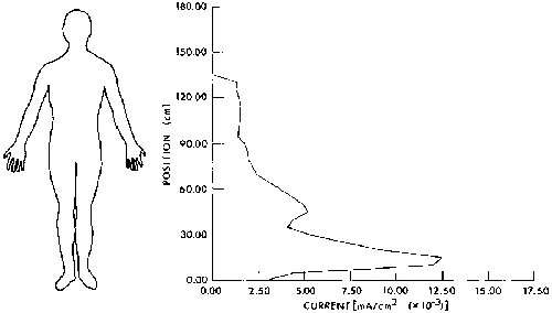 Calculated current distribution as a function of position in man with hand contacting a large object and with feet grounded. A 1-mA current is assumed to floating throughb the arm, thorax, and legs of the subject to the ground, F=60 Hz (Guy and Chou, 1982).