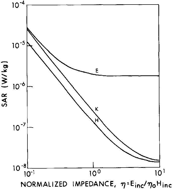 5.13. Average SAR in a prolate spheroidal model of an average man as a function of normalized impedance for each of three polarizations