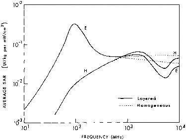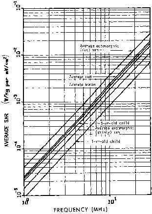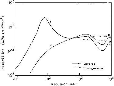 5.7. Calculated average SAR in a prolate spheroidal model of an average man, as a function of frequency for several values of permittivity