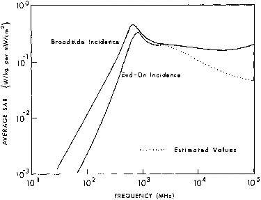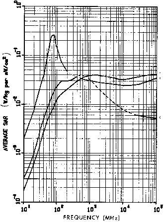 3.39. Calculated whole-body average SAR versus frequency for models of an average man for three standard polarizations