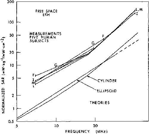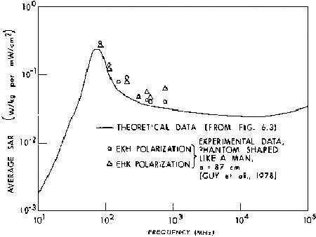 8.1A. Comparison of measured (experimental) and calculated (theoretical) SAR values for an average man in free space, E polarization