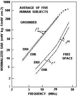 8.18. Frequency dependence of the average absorption rates for five human subjects in the EKH and EHK, orientations under both free-space and grounded conditions