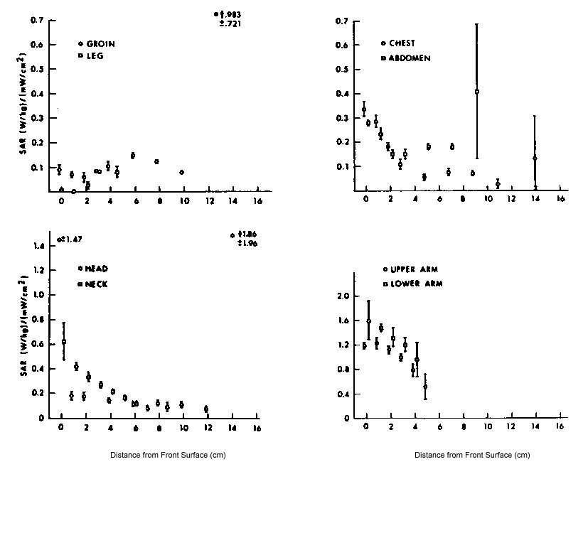 8.24. Normalized microwave absorption profiles in the man-sized model at 2.0 GHz