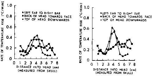 8.26. Rate of temperature rise from RFR exposure at the right side of a detached M. mulatta head; 1.2 GHz, CW, 70mW/cm2, far field