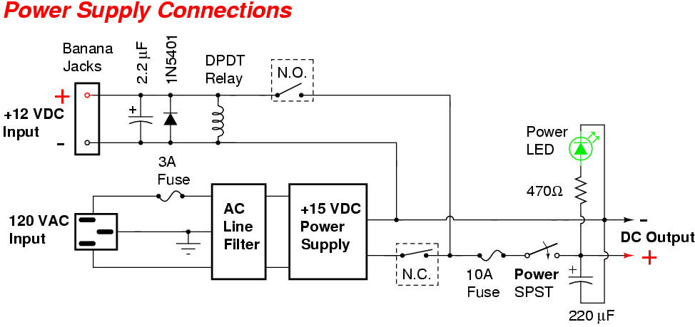 For this project, the power source will be both AC and DC. An old +15 VDC, 3 Amp laptop switching power supply will be the main power supply, and a DPDT relay will switch between the AC or DC power when an external +12 VDC power source is applied.