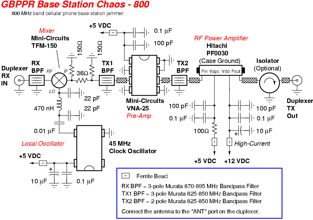 A similar device can also be constructed to disable cellular phone systems in the 1.9 GHz PCS band. You'll just need to replace the duplexer, filters, RF power amplifier, and antenna with ones which cover that frequency range. You'll also need to replace the 45 MHz clock oscillator with one that operates at 80 MHz.