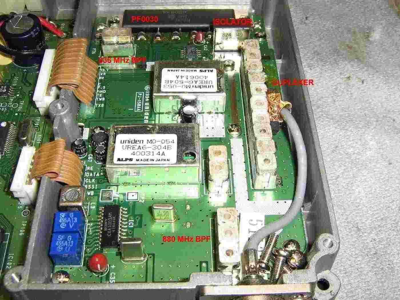 Shown above is an Uniden CP1700 analog cellular phone (AMPS). It uses the common Hitachi PF0030 RF power amplifier module, and also has nice, non-surface mount Murata bandpass filters on both the transmit and receive sides. It also has a very nice antenna duplexer and even a protection isolator on the RF output of the PF0030 amplifier.