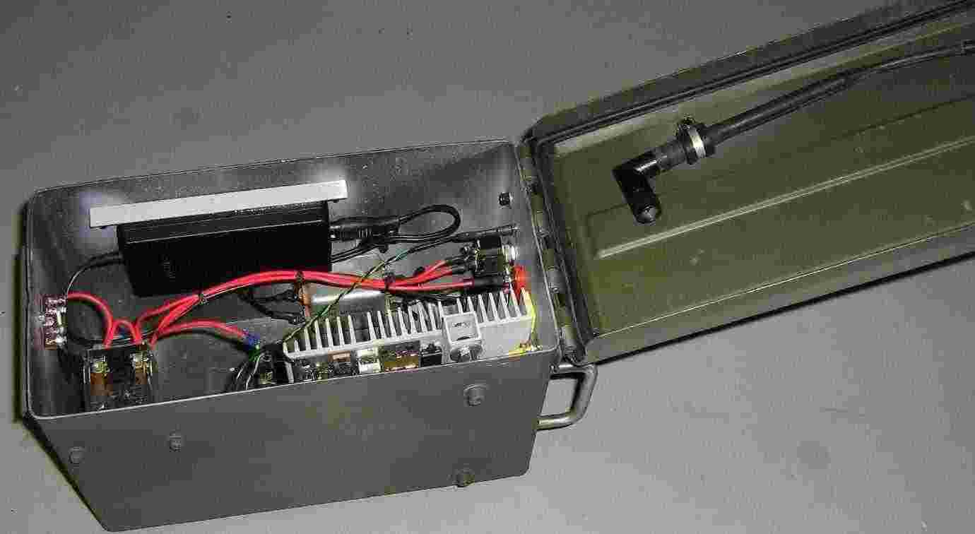 A fuse holder and a 10 amp fuse were added to the side of the heatsink. The jammer itself will be mounted using a small piece of aluminum square tubing and some 1/4-inch couplers and hardware.