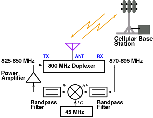 Now, the base station's transmitted output frequency (870-895 MHz) will be mixed with a 45 MHz local oscillator signal. The new, lower IF frequency (825-850 MHz) will be filtered, amplified, and finally rebroadcast. The cellular base station will now essentially be jamming itself. Everytime the base station's transmitters go on the air, the base station will have its receiver's jammed by its own transmitted signal.