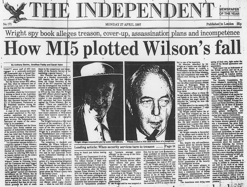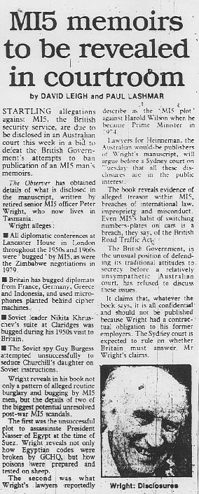 | On April 27, 1987 the Independent published an article containing much new material from Wright's book, which is shown below. |