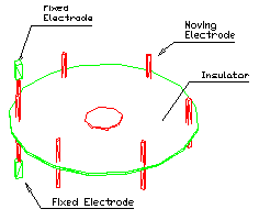 Another approach is to have pairs of fixed electrodes, either arranged so that the moving electrodes pass by the fixed ones, as in the above scheme, or so the electrode ends approach. This latter approach has the same disadvantages as the scheme where the moving electrodes are radial. An advantage of the parallel pin gap is that the motor/bearing axial play doesn't affect the gap distance.