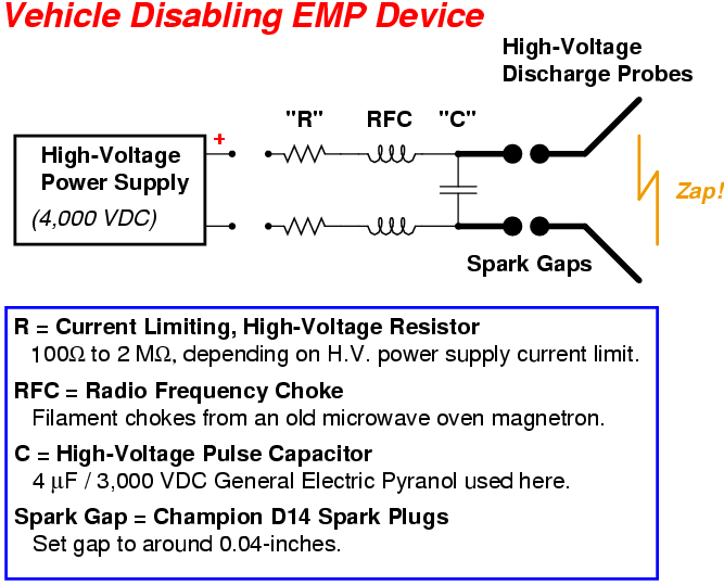 For the third article in this series, we'll be focusing on Electromagnetic Pulse (EMP) devices which have the capability to disable a moving or stationary vehicle. The idea revolves around first charging a high-voltage pulse capacitor up to a fairly high voltage. Then, when a vehicle passes over it - completing the circuit - the capacitor discharges via two spark gaps and two long, metal contact probes. The metal probes help to directly couple the high-voltage, high-current pulse onto the frame or engine block of the vehicle. Since electronic fuel, ignition, and other engine controls are all connected to the vehicle's frame (ground), raising the frame to a high-voltage potential will hopefully destroy any solid-state electronic devices connected to it. The use of two spark gaps helps to maintain the high-voltage on the vehicle's frame for just a few more microseconds. The only problem using this device is that you'll need very high voltages for it to work properly. At least 30,000 VDC should be used to help the discharge "arc" cut through any rust, dirt, or grim on the vehicle's frame. If you use over 100,000 VDC, you might even be able to get the return arc to use a path to Earth ground, and that will almost guarantee a disabled vehicle. Also, the capacitor's value doesn't have to be very large, but you'll want it to have at least 50 joules of energy. The device shown here was only operated at 4,000 VDC - and I couldn't get anyone to let me test it on their vehicle! So, as it is, this method is still very experimental, but it should work. It'll also zap regular electronic devices as well. Just rub the contact probes against it...