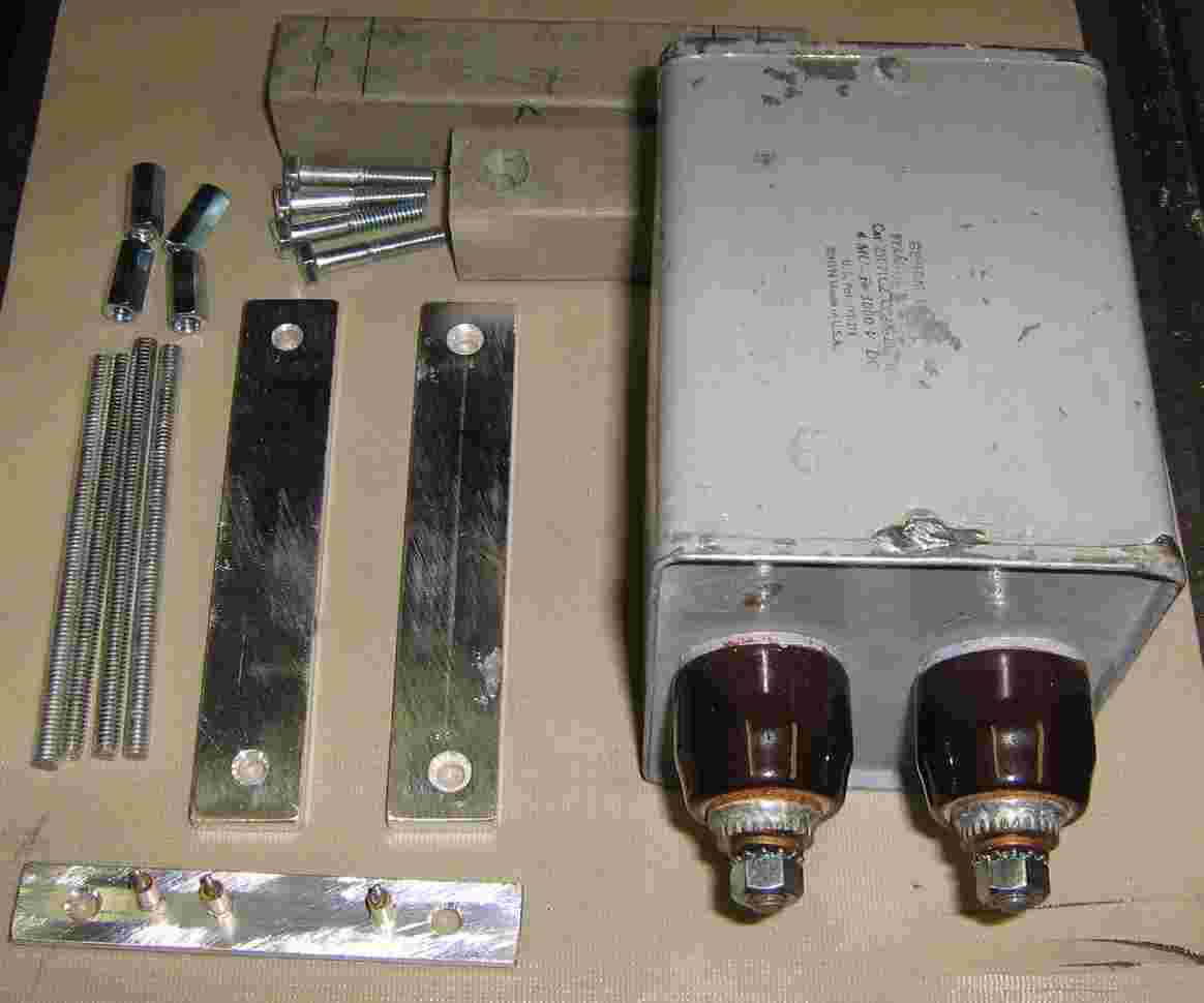 Capacitor mounting hardware overview. The high-voltage GE Pyranol capacitor is on the right.