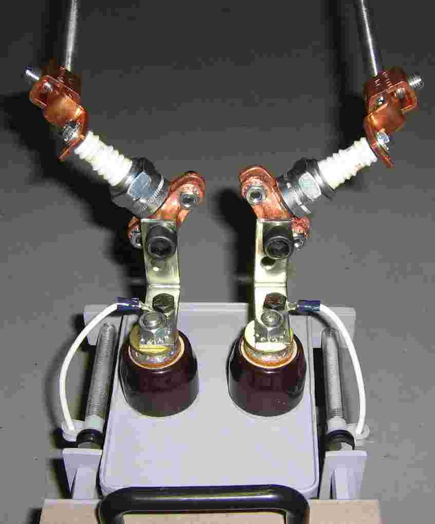 Underneath view of the the spark plugs and their associated mounting hardware. The WHITE wires are for the capacitor's charging lines. High-voltage oil capacitors like this one are not polarized.