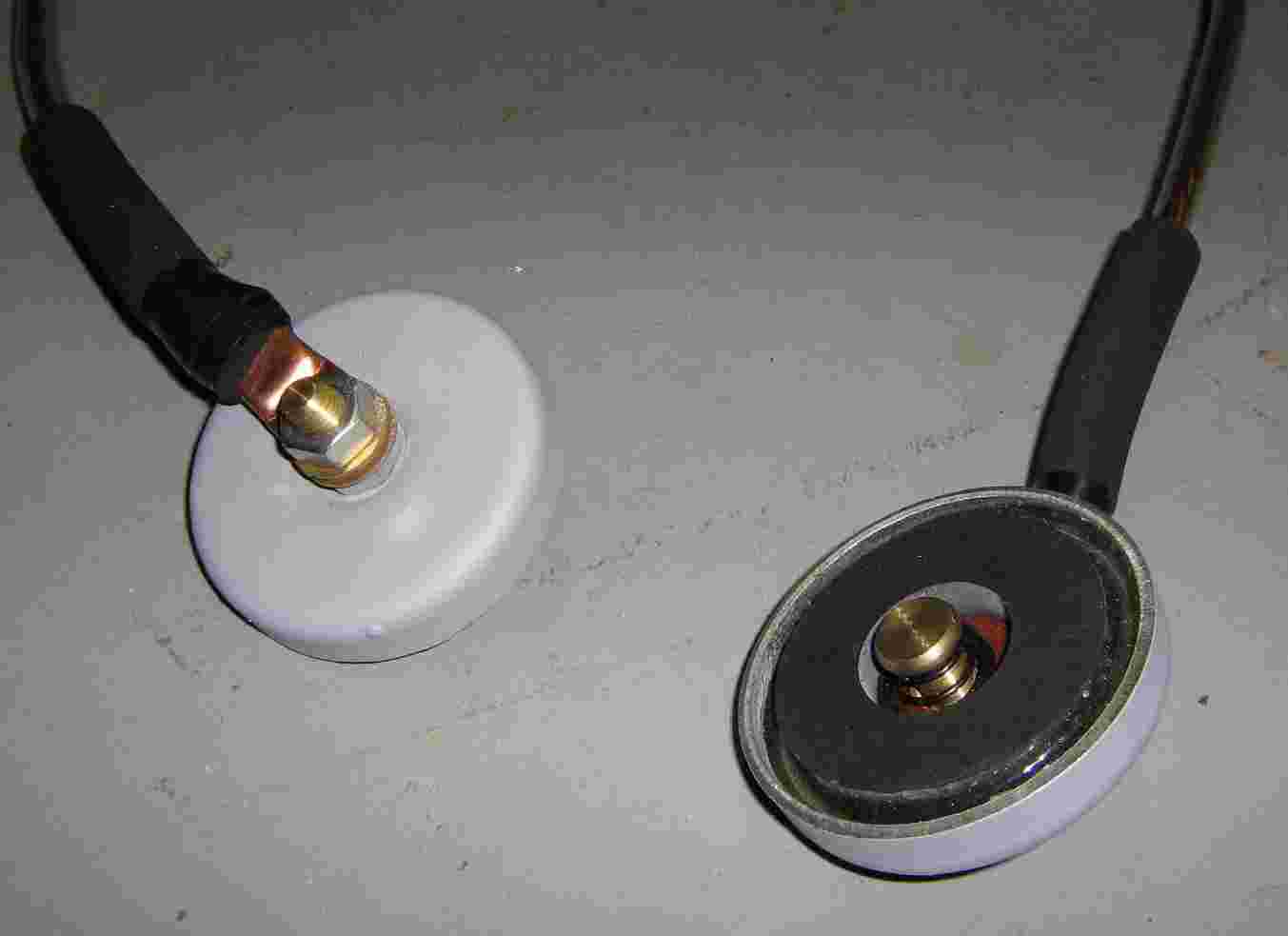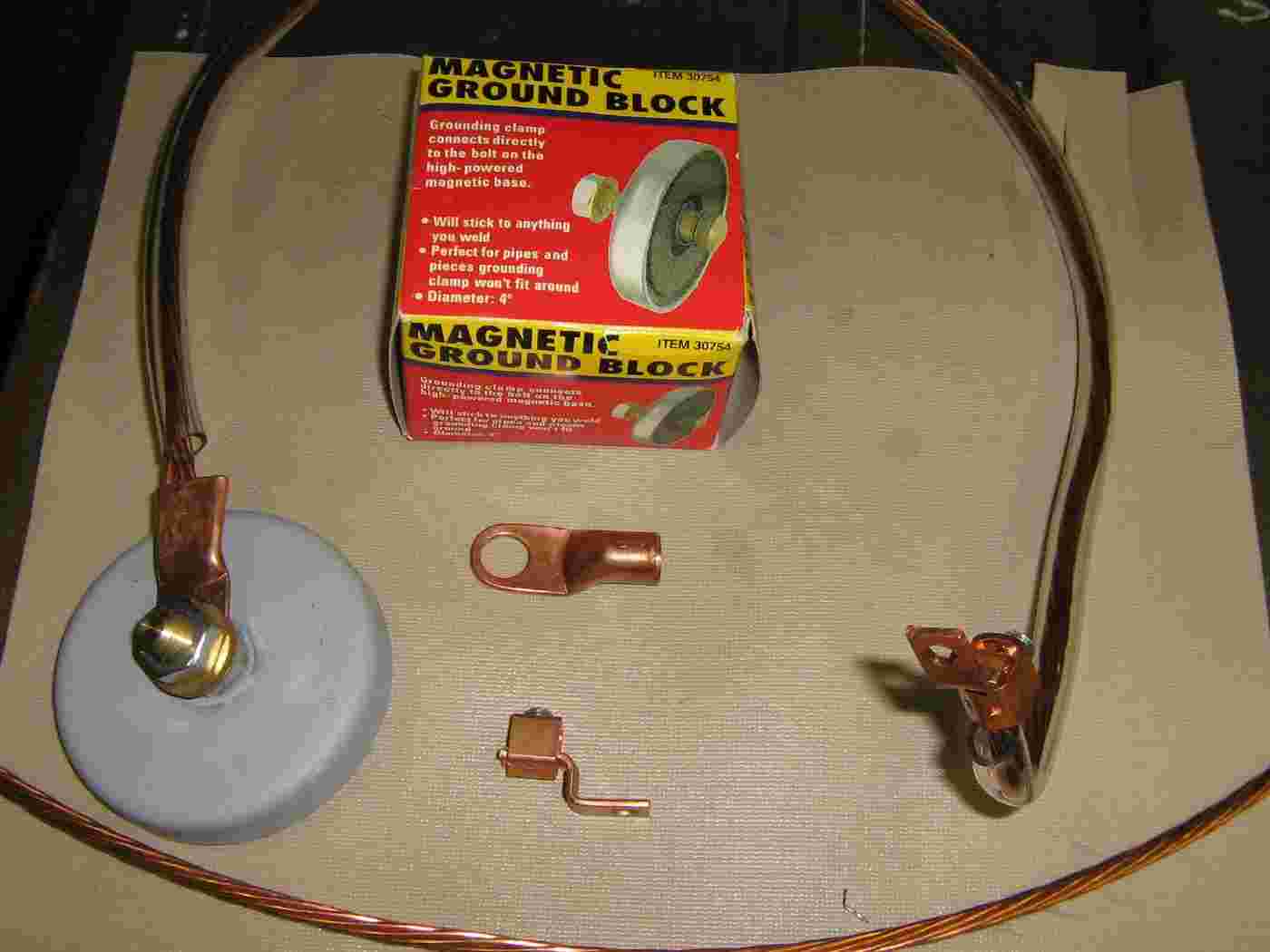 View of the two magnetic ground blocks and their attached wires. You'll want to place one of the ground blocks on the engine or oil pan and the other on the vehicle's frame. This should help the discharge pulse to flow from the engine to the frame, blowing out any electronic engine controls in the path. Of course, you'll probably want to experiment ahead of time.