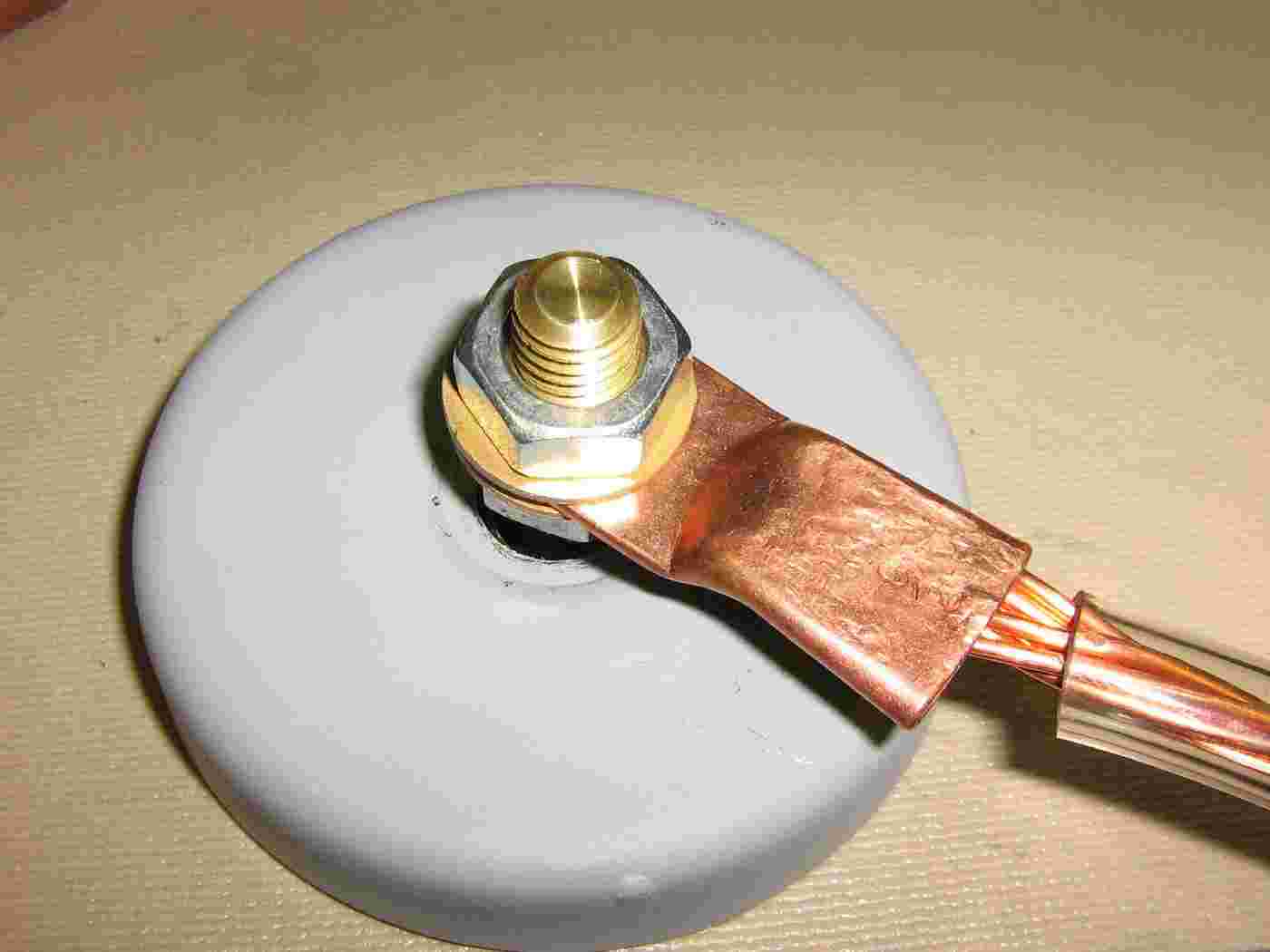 Closeup of the copper ring terminal attached to the magnetic ground block. The copper ring terminal was attached to the ground wire using a vise because I didn't have one for use on smaller diameter wire.