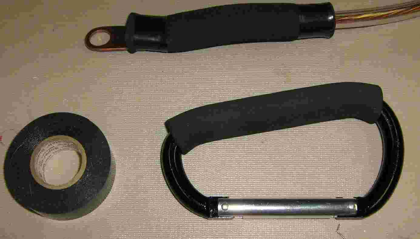 A handy addition is a foam handle. You'll want to add this if you are positioning the magnetic ground contact blocks while the capacitor is already charged. The pieces of foam tubing comes from those cheap carabiners you can buy at the hardware store.