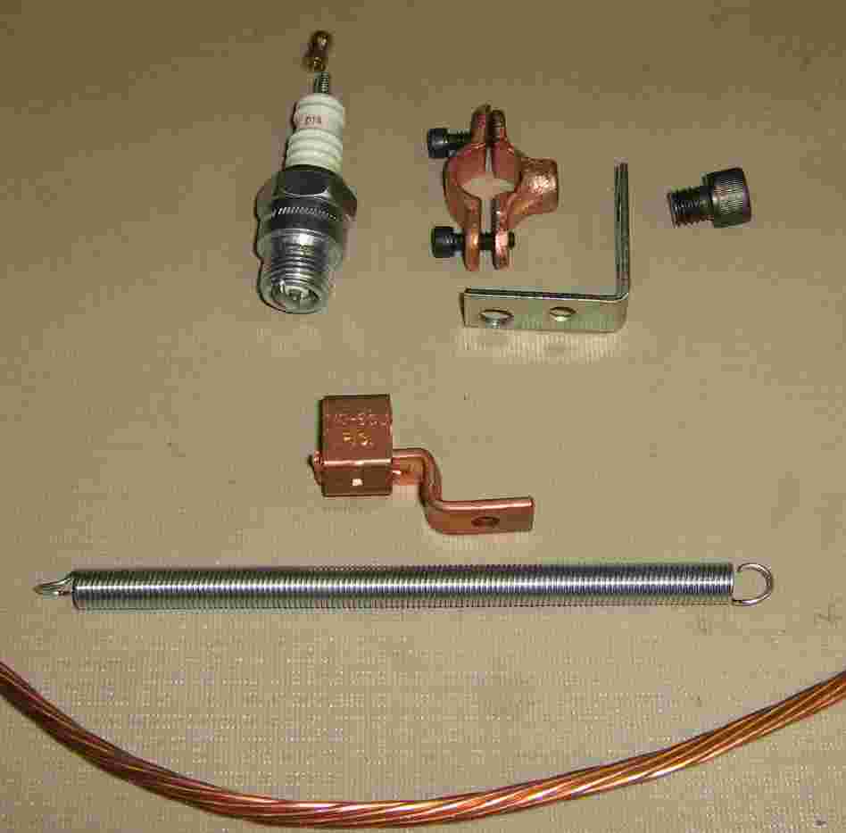 Spark gap parts. A Champion D14 spark plug is secured using a 1/2-inch copper plated split-ring hanger. This is then attached to a 1-inch by 1-inch L-bracket to the capacitor's terminals. Attached to the screw terminal on the spark plug is a 0-6 AWG copper mechanical lug. This is used to hold a 6-inch long, 3/8-inch diameter utility spring (C-239 on the package). The spring acts as the metal contact probe for when an automobile passes over it. If you can't find a spring, or if they are too short, you can use a piece of #6 or #4 copper ground wire.
