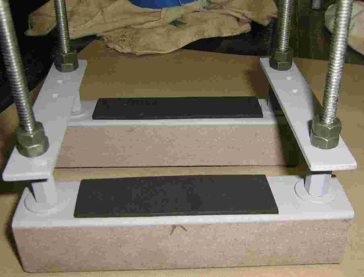 Constructed high-voltage capacitor mounting hardware. The black strips are pieces of art foam to help protect the capacitor. The 1/4-inch bolts are counter-sunk into the plastic block.