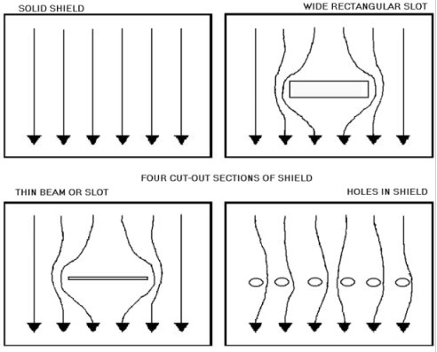 Figure 1 shows how current flows in a continuous shield and how discontinuities can affect the currents induced in the shield. Figure 1a shows induced currents in a solid shield with no discontinuity. Figure 1b shows a wide rectangular slot detouring the induced currents, while Figure 1c shows almost the same effect on current flow with a much narrower slot. Figure 1d shows that the group of small holes has a much less current detouring effect than the slots, producing less leakage even though the total area is the same as the slot.