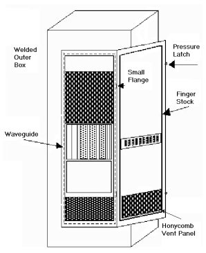 When the gasket will be subjected to multiple compressions, beryllium copper gaskets in the form of small spring fingers or spiral type gaskets like the one shown in Figure 9 are most popular. A typical use is in commercial computer application shown in Figure 10. In a straight line they provide less direct shielding effectiveness than other gasket materials, so are usually used with a wave guide slot or wide metal flange if high radiated shielding attenuation is necessary such as shown for the workstation in Figure 11. Note in Figure 11 that the door is hinged and compressed into the finger stock with a latching mechanism when closed.