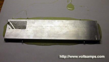 A top view shows the thickness of the epoxy. By touching the aluminum you get an idea of how much heat is produced during the chemical reaction between the resin and hardener. The temperatures get high enough to even melt through packaging tape!