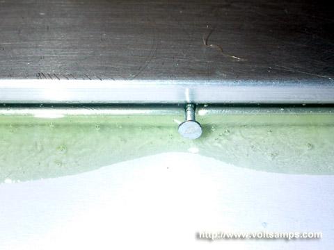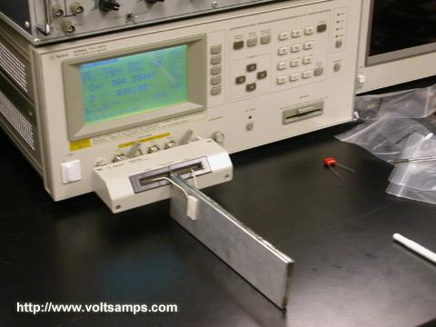Having measured the plate dimensions the area turned out to be 10200mm^2. Then I measured the diameter of the spacer nails I used and got a value of 0.93mm. After calculating the theoretical capacitance of 97pF I went ahead and measured the actual epoxy capacitor with an LCR meter and found it to be 385pF. Being limited to two significant figures the dielectric constant came out to be 4.0.